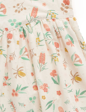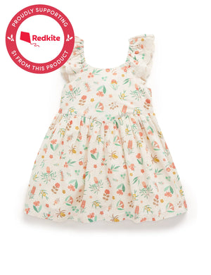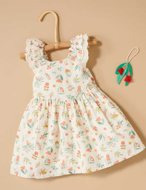 Featuring ruffles that cascade over the shoulder to form wing like points at the back, designed in a beautiful all over floral print, hand painted by Flora Waycott. Made from the softest 100% Organic Cotton, making this dress soft and breathable for warmer days.