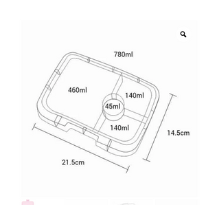 • Balance and portion control with pre-portioned removable illustrated tray. Yumbox Panino tray has a 2 cup sandwich/salad-friendly section, two ½ cup servings plus a 30ml dip/treat well