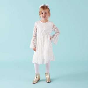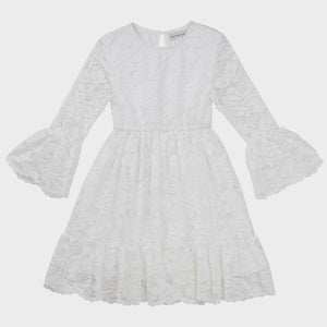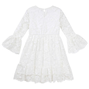 A stunning soft lace dress with bell shaped sleeves. Perfect for your girl's special occasion.