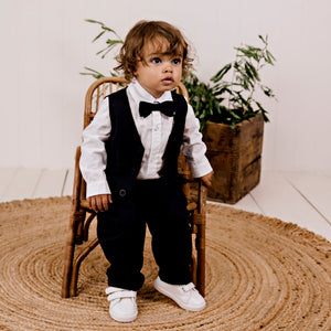 Classic navy linen vest is fully lined. Will suit any special occasion and be breathable so comfortable for your little one.
