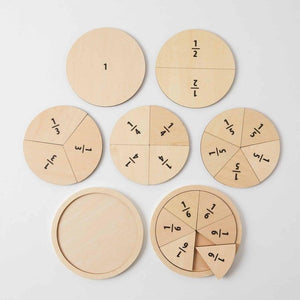 The set includes two round trays for storing the fraction pieces which range from one whole to one-sixth