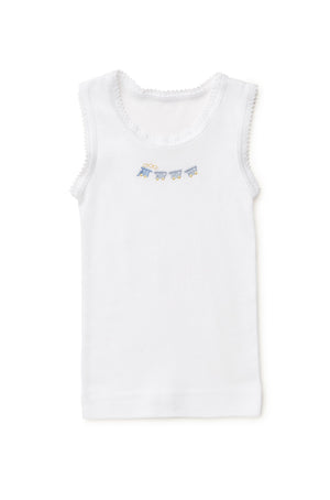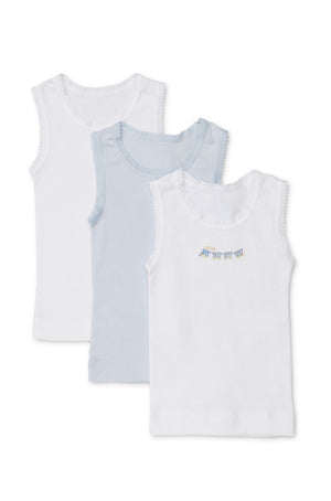 This 3-pcs boy's singlets are in 1 x white, 1 x blue, and 1 x white with train embroidery and is made from the signature Marquise soft cotton which makes the singlet breathable and keeps your little one warm and secure.  The ideal newborn gift for boys.