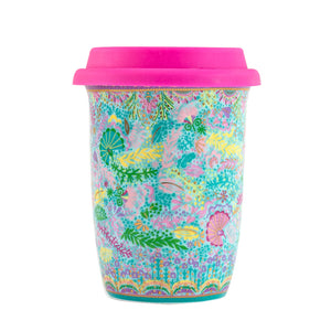 In a colour-happy combo of aqua, purple, pink and green, this portable mug will add a shot of inspiration to your coffee on the go with: