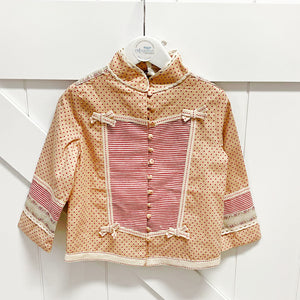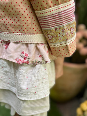 A lightweight cotton jacket with beautiful ribbon detail and covered buttons!