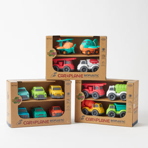 Crafted from sustainable wheat straw bioplastic and lovingly packaged in recycled, recyclable materials, each set includes a delightful mix of vehicles—from speedy cars and sturdy trucks to whirring planes and brave emergency responders.